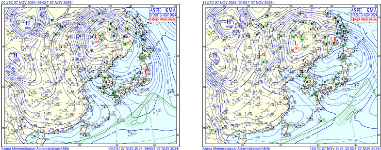 [ Surface weather chart 2024-11-27 21KST ]